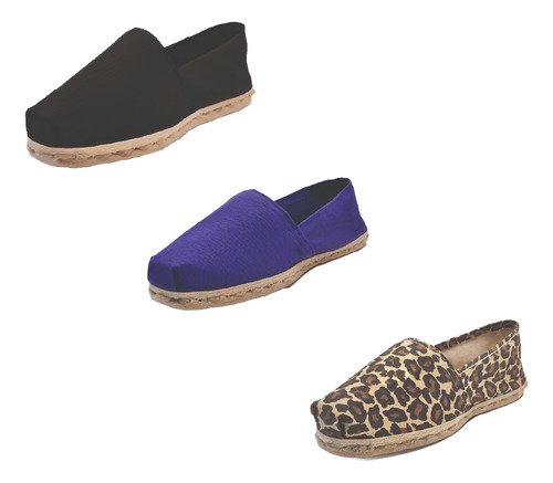 TriPack de alpargata iberia con modelos negro, morado y animal print con un rango de talla de 34 a 39.