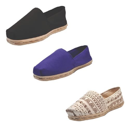 TriPack de alpargata iberia con modelos negro, morado y crudo étnico con un rango de talla de 34 a 39.
