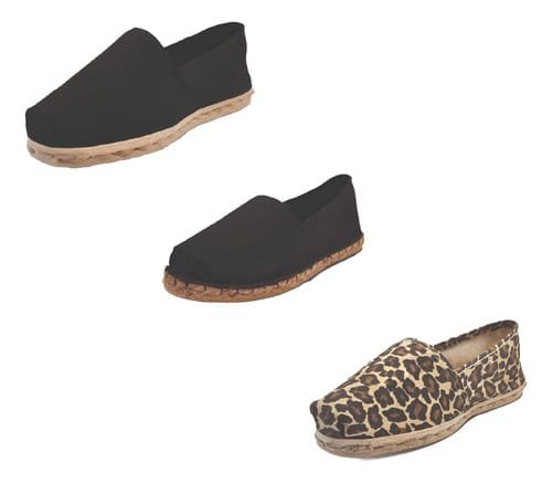 TriPack de alpargata iberia con modelos negro, negro goma y animal print con un rango de talla de 34 a 39.