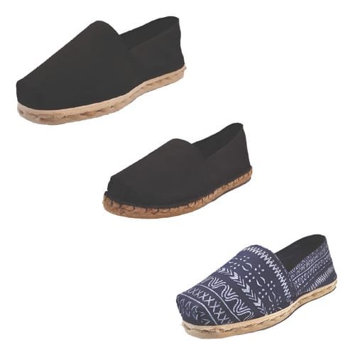 TriPack de alpargata iberia con modelos negro, negro goma y azul étnico con un rango de talla de 34 a 39.