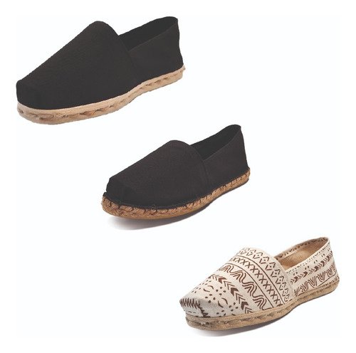 TriPack de alpargata iberia con modelos negro, negro goma y crudo étnico con un rango de talla de 34 a 39.