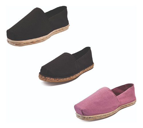 TriPack de alpargata iberia con modelos negro, negro goma y jacarandá con un rango de talla de 34 a 39.