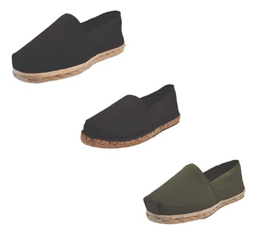 TriPack de alpargata iberia con modelos negro, negro goma y verde militar con un rango de talla de 34 a 42.