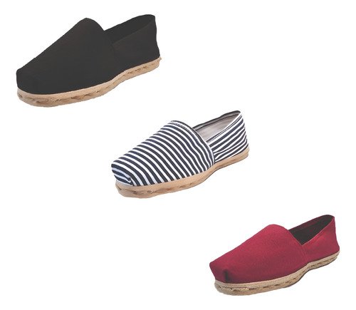TriPack de alpargata iberia con modelos negro, ray azul/blanco y burdeo con un rango de talla de 34 a 39.