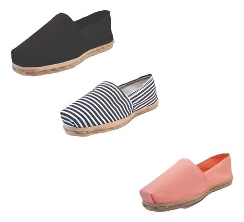 TriPack de alpargata iberia con modelos negro, ray azul/blanco y coral con un rango de talla de 34 a 39.