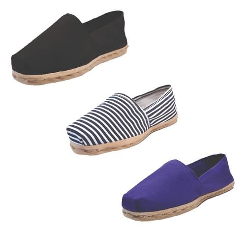 TriPack de alpargata iberia con modelos negro, ray azul/blanco y morado con un rango de talla de 34 a 39.