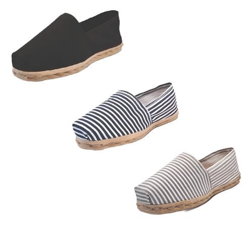 TriPack de alpargata iberia con modelos negro, ray azul/blanco y ray gris/blanco con un rango de talla de 34 a 39.