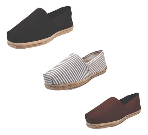 TriPack de alpargata iberia con modelos negro, ray gris/blanco y café con un rango de talla de 34 a 39.