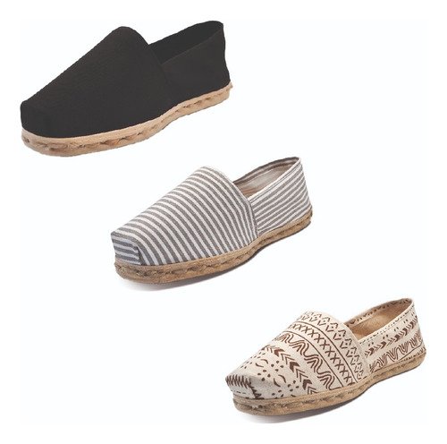TriPack de alpargata iberia con modelos negro, ray gris/blanco y crudo étnico con un rango de talla de 34 a 39.