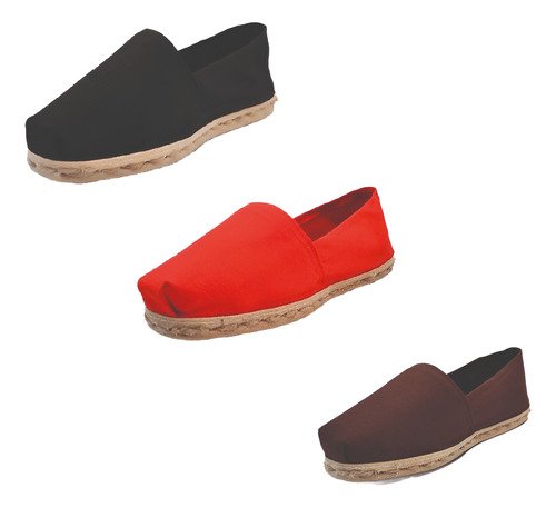 TriPack de alpargata iberia con modelos negro, rojo y café con un rango de talla de 34 a 39.