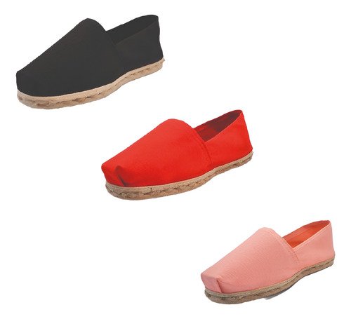 TriPack de alpargata iberia con modelos negro, rojo y coral con un rango de talla de 34 a 39.