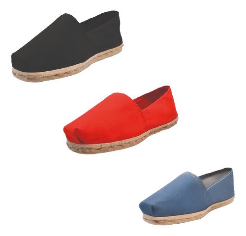 TriPack de alpargata iberia con modelos negro, rojo y mezclilla con un rango de talla de 34 a 39.