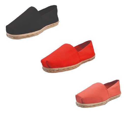 TriPack de alpargata iberia con modelos negro, rojo y terracota con un rango de talla de 34 a 39.