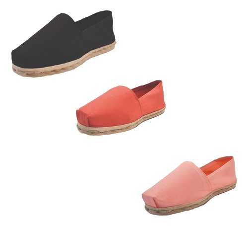 TriPack de alpargata iberia con modelos negro, terracota y coral con un rango de talla de 34 a 39.