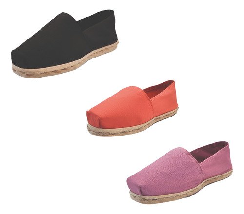 TriPack de alpargata iberia con modelos negro, terracota y jacarandá con un rango de talla de 34 a 39.