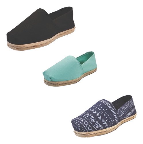 TriPack de alpargata iberia con modelos negro, turquesa y azul étnico con un rango de talla de 34 a 39.
