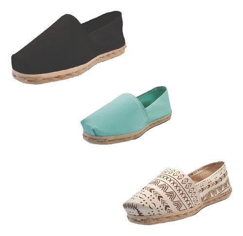 TriPack de alpargata iberia con modelos negro, turquesa y crudo étnico con un rango de talla de 34 a 39.