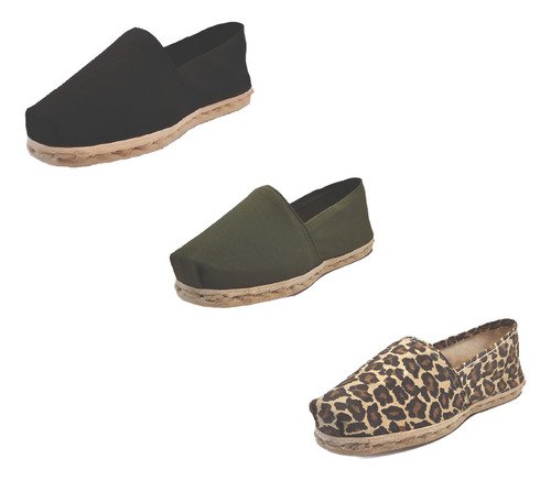 TriPack de alpargata iberia con modelos negro, verde militar y animal print con un rango de talla de 34 a 39.