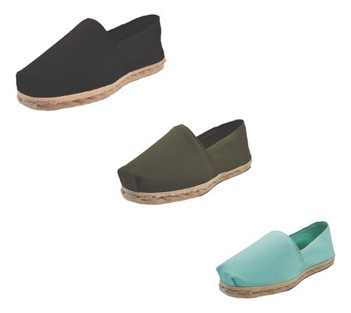 TriPack de alpargata iberia con modelos negro, verde militar y turquesa con un rango de talla de 34 a 39.