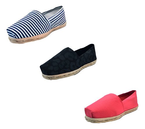 TriPack de alpargata iberia con modelos ray azul/blan, animal print negro y coral con un rango de talla de 34 a 39.