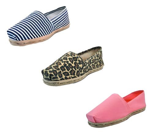 TriPack de alpargata iberia con modelos ray azul/blan, animal print y coral con un rango de talla de 34 a 39.