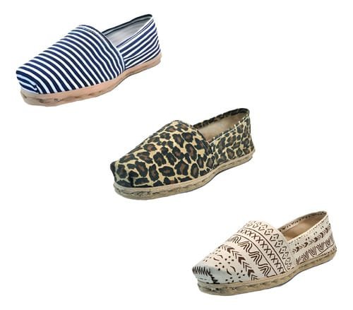TriPack de alpargata iberia con modelos ray azul/blan, animal print y crudo étnico con un rango de talla de 34 a 39.