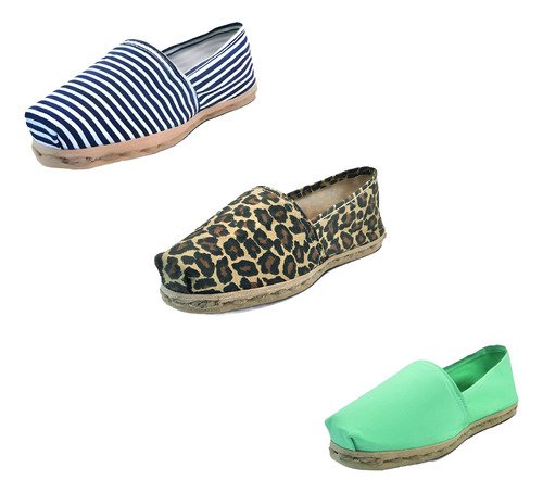 TriPack de alpargata iberia con modelos ray azul/blan, animal print y turquesa con un rango de talla de 34 a 39.