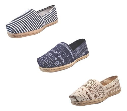 TriPack de alpargata iberia con modelos ray azul/blan, azul étnico y crudo étnico con un rango de talla de 34 a 39.
