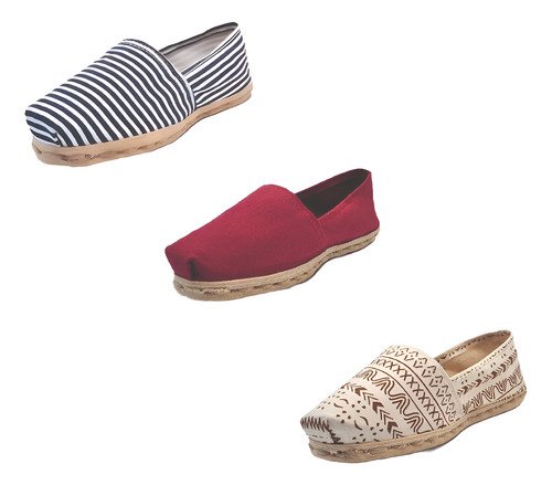 TriPack de alpargata iberia con modelos ray azul/blan, burdeo y crudo étnico con un rango de talla de 34 a 39.
