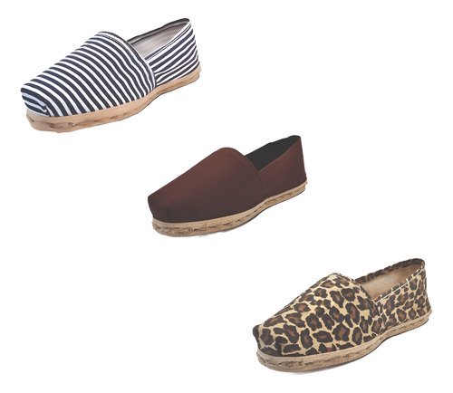 TriPack de alpargata iberia con modelos ray azul/blan, café y animal print con un rango de talla de 34 a 39.