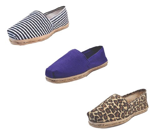 TriPack de alpargata iberia con modelos ray azul/blan, morado y animal print con un rango de talla de 34 a 39.
