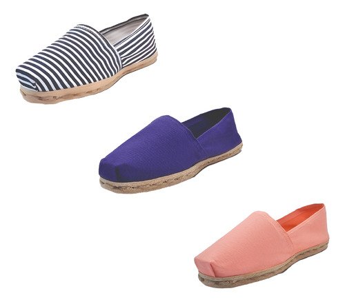 TriPack de alpargata iberia con modelos ray azul/blan, morado y coral con un rango de talla de 34 a 39.
