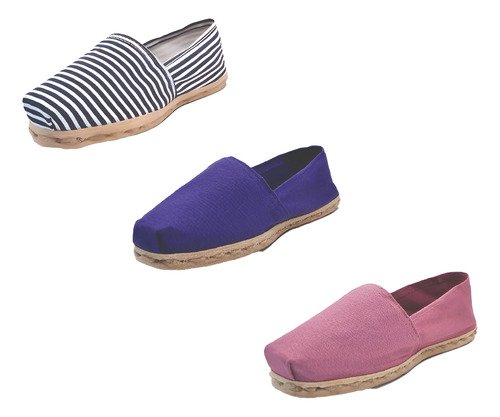 TriPack de alpargata iberia con modelos ray azul/blan, morado y jacarandá con un rango de talla de 34 a 39.