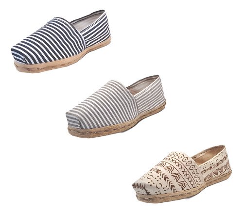 TriPack de alpargata iberia con modelos ray azul/blan, ray gris/blan y crudo étnico con un rango de talla de 34 a 39.