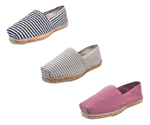 TriPack de alpargata iberia con modelos ray azul/blan, ray gris/blan y jacarandá con un rango de talla de 34 a 39.
