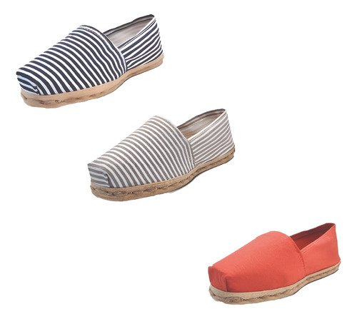 TriPack de alpargata iberia con modelos ray azul/blan, ray gris/blan y terracota con un rango de talla de 34 a 39.