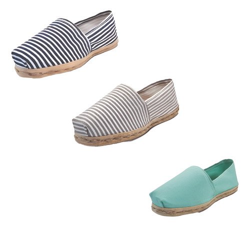 TriPack de alpargata iberia con modelos ray azul/blan, ray gris/blan y turquesa con un rango de talla de 34 a 39.