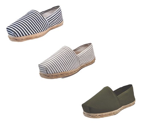 TriPack de alpargata iberia con modelos ray azul/blan, ray gris/blan y verde militar con un rango de talla de 34 a 39.