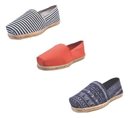 TriPack de alpargata iberia con modelos ray azul/blan, terracota y azul étnico con un rango de talla de 34 a 39.