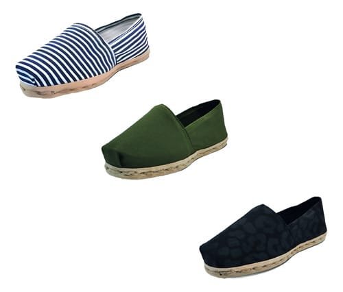 TriPack de alpargata iberia con modelos ray azul/blan, verde militar y animal print negro con un rango de talla de 34 a 39.