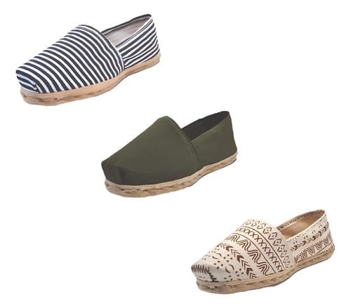 TriPack de alpargata iberia con modelos ray azul/blan, verde militar y crudo étnico con un rango de talla de 34 a 39.