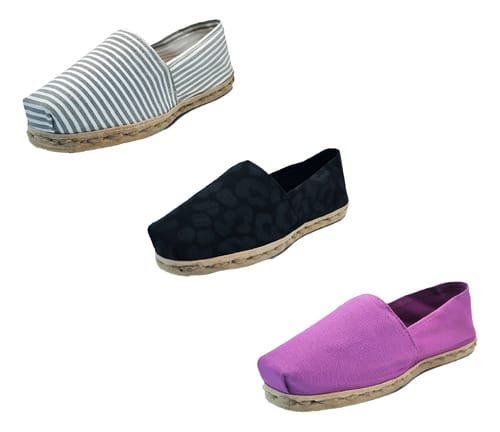 TriPack de alpargata iberia con modelos ray gris/blan, animal print negro y jacarandá con un rango de talla de 34 a 39.