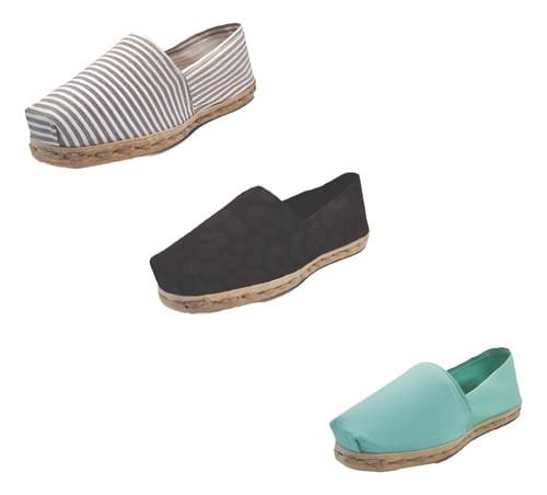 TriPack de alpargata iberia con modelos ray gris/blan, animal print negro y turquesa con un rango de talla de 34 a 39.