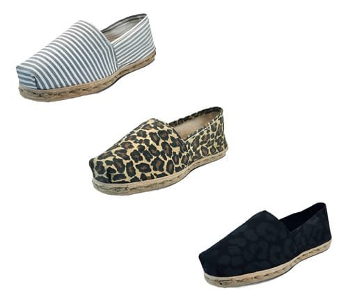 TriPack de alpargata iberia con modelos ray gris/blan, animal print y animal print negro con un rango de talla de 34 a 39.