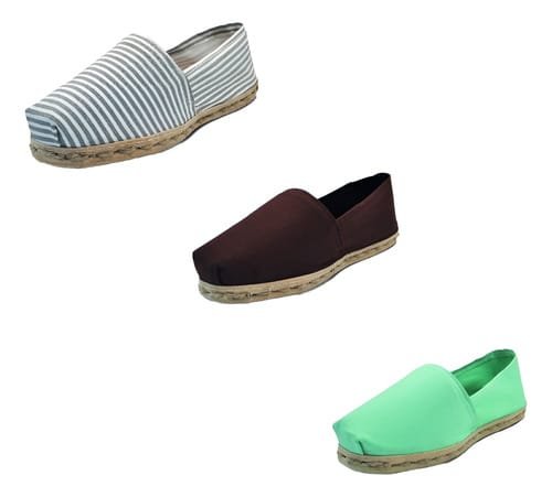 TriPack de alpargata iberia con modelos ray gris/blan, cafe y turquesa con un rango de talla de 34 a 39.