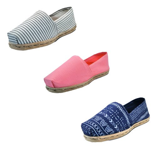 TriPack de alpargata iberia con modelos ray gris/blan, coral y azul étnico con un rango de talla de 34 a 39.