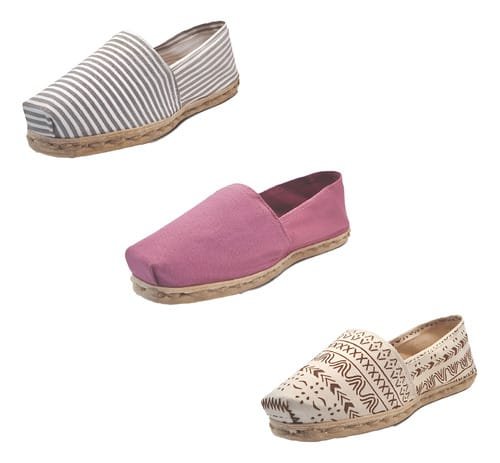 TriPack de alpargata iberia con modelos ray gris/blan, jacarandá y crudo étnico con un rango de talla de 34 a 39.