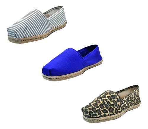 TriPack de alpargata iberia con modelos ray gris/blan, morado y animal print con un rango de talla de 34 a 39.