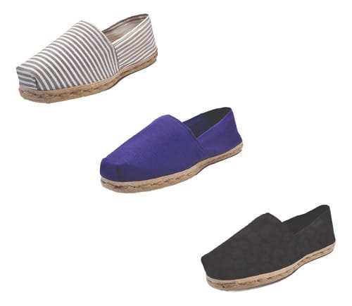 TriPack de alpargata iberia con modelos ray gris/blan, morado y animal print negro con un rango de talla de 34 a 39.