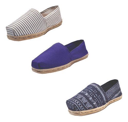 TriPack de alpargata iberia con modelos ray gris/blan, morado y azul étnico con un rango de talla de 34 a 39.